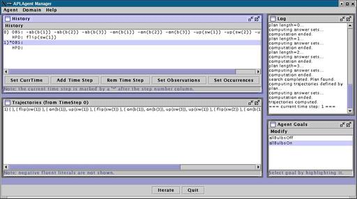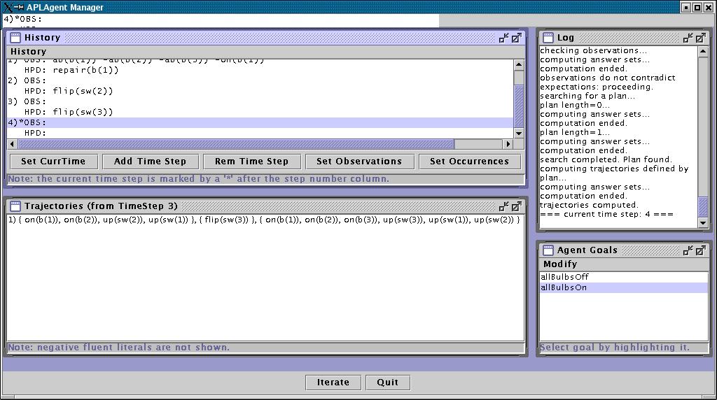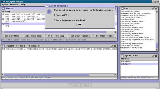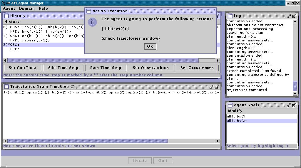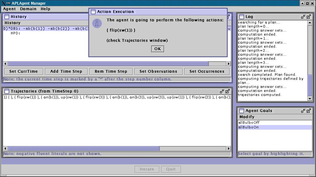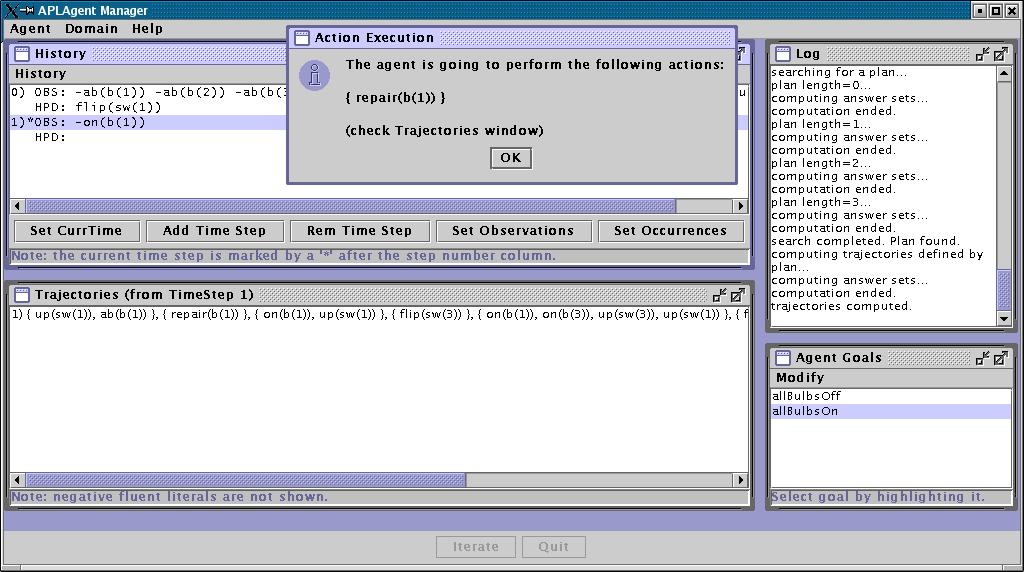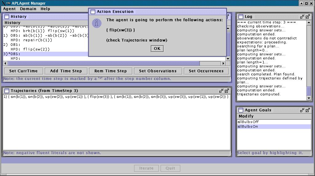 0. Then, it computes a new plan to achieve goal "allBulbsOn", and decides to perform