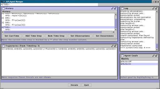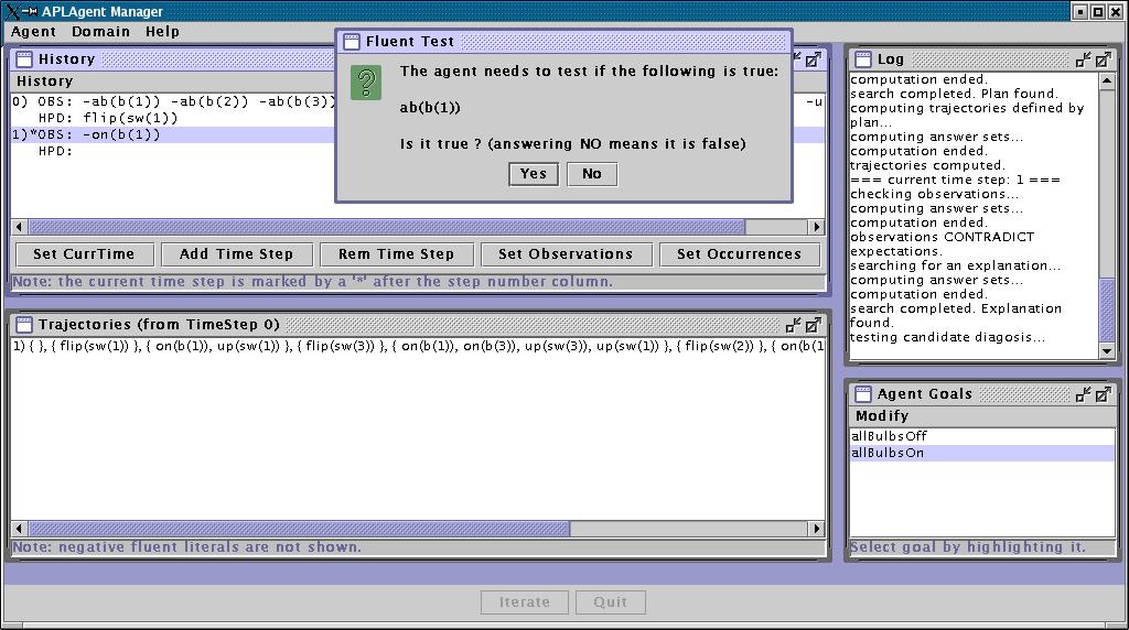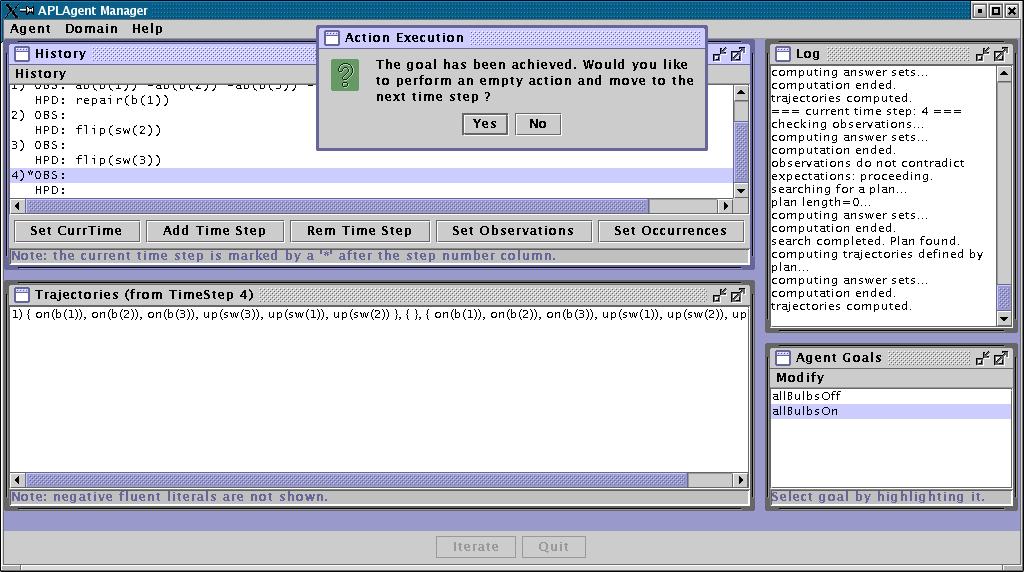 If you wish, you can now enter new observations. If you do not specify any observation, the agent will assume that everything went according to its expectations, and will declare that it achieved its goal after a few iterations of the loop.