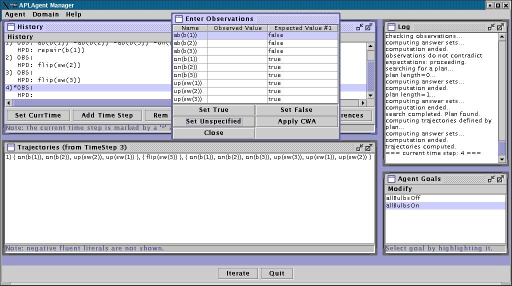in bulb 1. To do this, we will enter the observation that on(b(1)) is false, i.e.